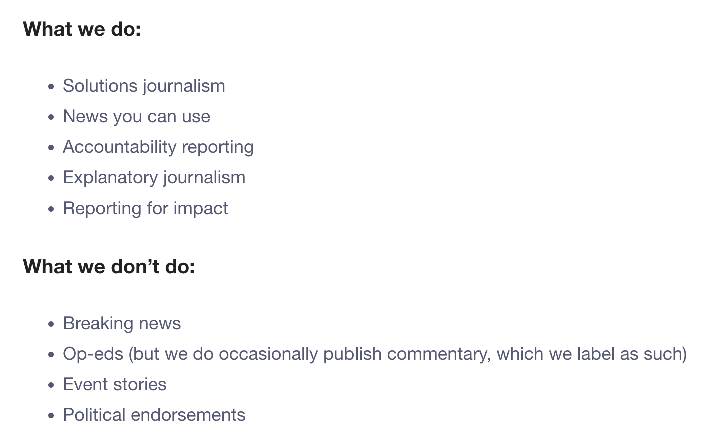 Throughout the entire page, they point to their mission of providing community-centric coverage. They explain this means their reporting will happen alongside the community, by gathering input and including a variety of community content collaborators. They also share how providing value to the community is their main measure of impact.