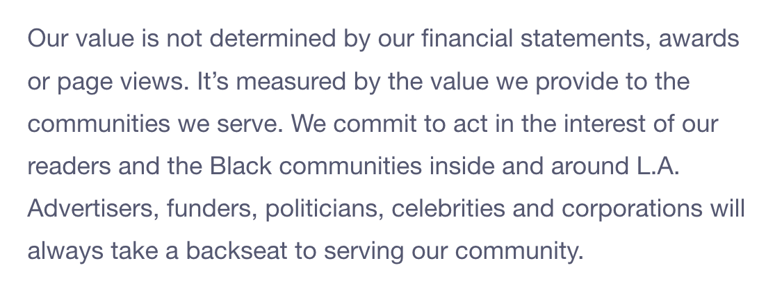 In this section, they get really clear about their coverage goals and explain how they aim to cover the Black community in LA differently than other news organizations. They also use a quick bullet point list to share what kind of news you can expect to see from them (and what news you WON’T see from them).