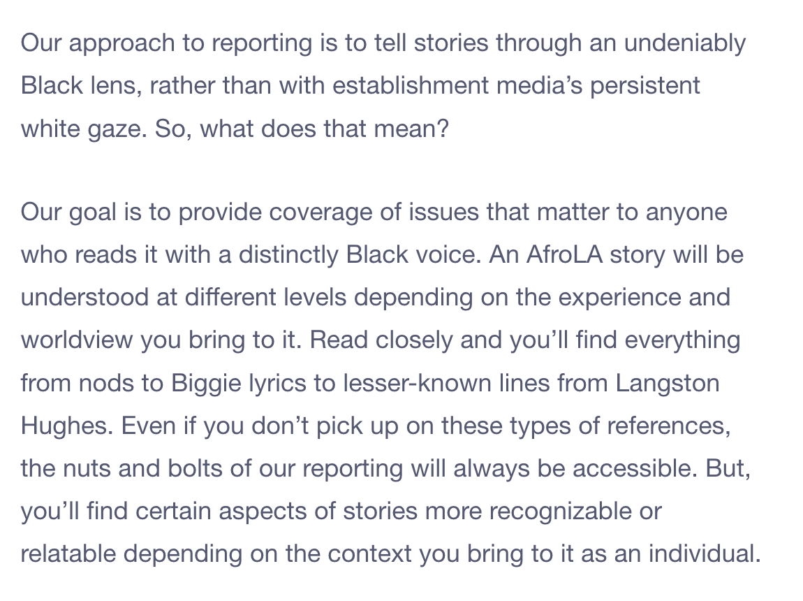 AfroLA, a startup in Los Angeles, recently published a new “About Us” page that succinctly and effectively shares the news organization’s goals and mission — and importantly, also how their coverage will be different.