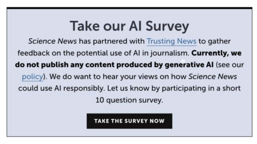 Note: This research is the first step in a year’s worth of work we have planned focused on AI disclosures and ethics, funded by a grant from the Patrick J. McGovern Foundation. There is a lot to learn, and future research might point to different solutions. But at Trusting News, we believe in learning in public, and sometimes that means sharing knowledge as it iterates. To follow our work on this topic, fill out this form.