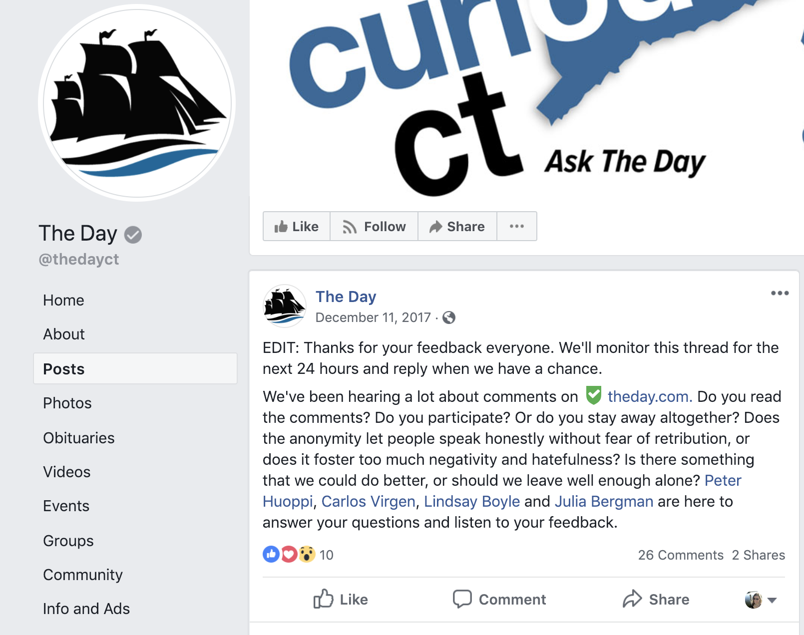 The Day held a Q&A on Facebook by allowing individuals to ask questions by commenting on a post. The newsroom then replied and answered questions in the same comment thread. They invited multiple people from the newsroom to participate and respond. It resulted in a very lively discussion.
