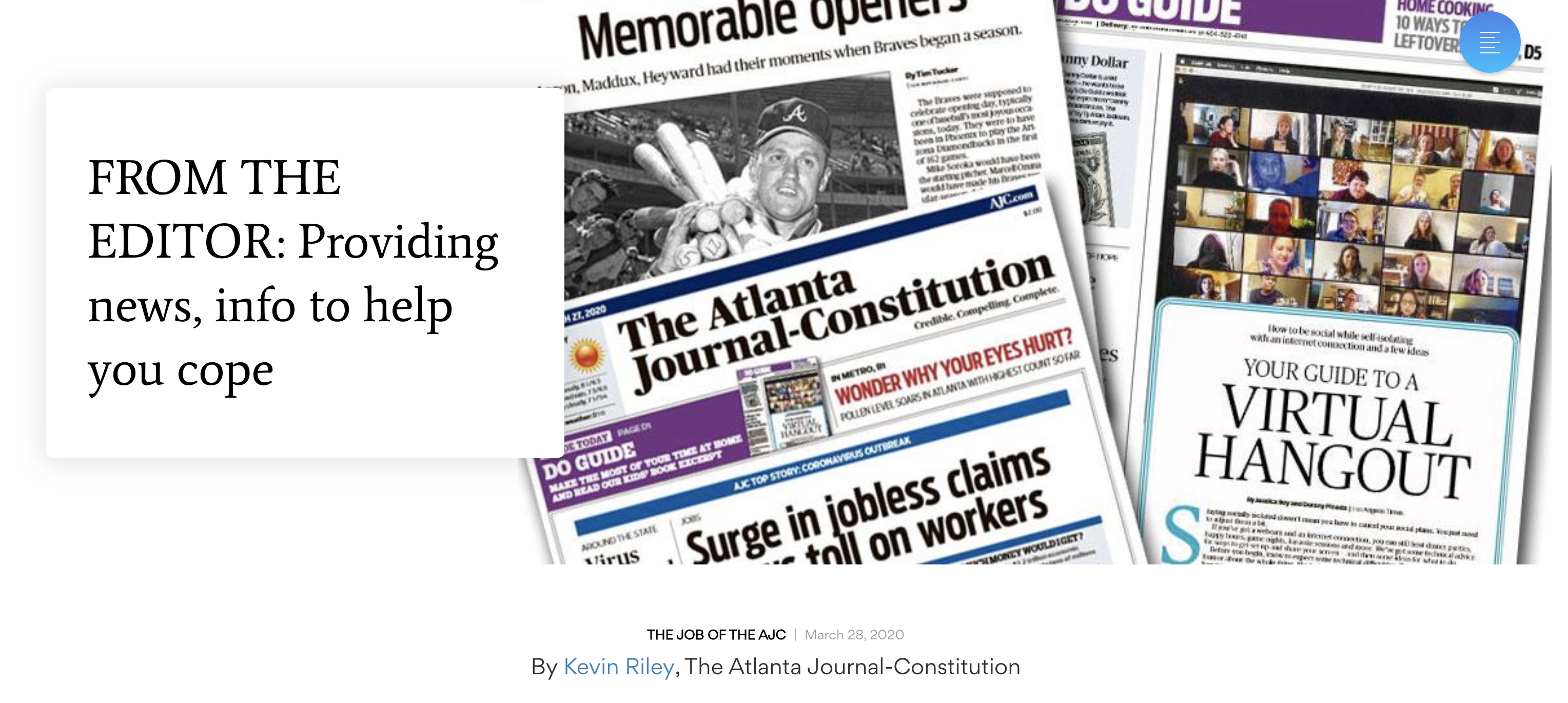 The editor of the Atlanta Journal Constitution Kevin Riley wrote a column explaining how the news organization’s coverage had changed since the start of the COVID-19 outbreak. “This situation has inspired some important changes at the AJC. I hope you’ve noticed those in the newspaper and at our website. And we, like so many of you, have had to change the way we work.” They highlighted their mission statement, pointed out how their print paper has changed to include more puzzles, a coloring page and a guide to help readers make the most of their time at home.