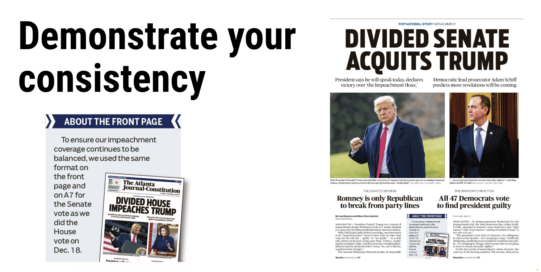 While reporting on the House impeachment vote again President Trump, the Atlanta Journal-Constitution included a box on the front page of its print paper that clearly stated how they were striving to provide fair coverage. “To ensure our impeachment coverage continues to be balanced, we used the same format on the front page and on A7 for the Senate vote as we did the House vote on Dec. 18,” the box read.