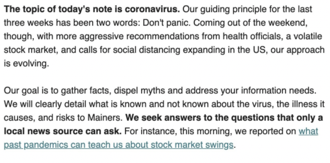 The Bangor Daily News in Maine used an editors note in a newsletter to share their reporting goals and mission during the coronavirus pandemic. The newsroom reminded the public that they didn’t want to cause panic, but instead, wanted to “gather facts, dispel myths and address your information needs,” the note read. “We will clearly detail what is known and not known about the virus, the illness it causes, and risks to Mainers. We seek answers to the questions that only a local news source can ask.” This work was done independently from Trusting News but embodies the work we do.
