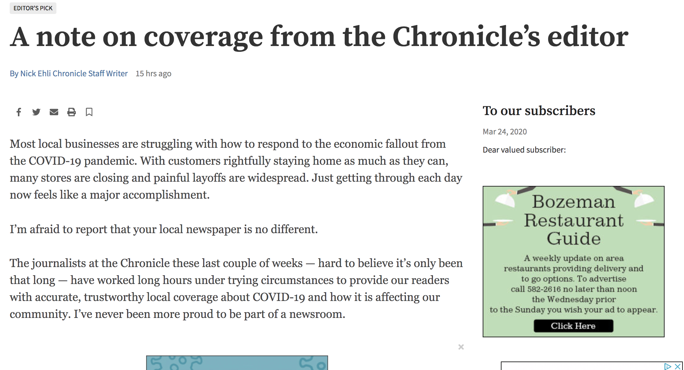 The editor of the Bozeman Chronicle Nick Ehli wrote a column explaining how economic changes during the coronavirus outbreak were impacting the paper’s bottom line. He explained in a transparent and straightforward tone that the paper had lost a significant amount of advertising money and how that was affecting the hours his reporters were able to work. “…out parent company, the Adams Publishing Group, this week ordered a top-to-bottom partial furlough for all of its employees. This means that — for the time being — our journalists will be working fewer hours than they were before. I’d like to tell you that you won’t notice any changes, that we will be able to cover our community with the same vigor you’ve hopefully come to expect, but that simply wouldn’t be true,” Ehli wrote. “Reporters and photographers working 30 hours a week instead of 40 will produce less content. There is no way around that fact.” This work was done independently from Trusting News but embodies the work we do.