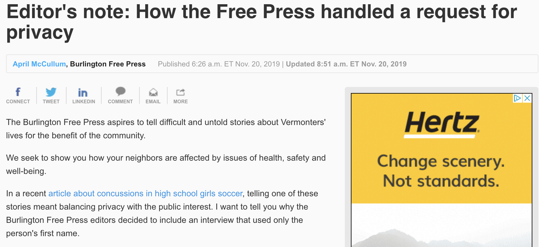 When a reporter at the Burlington Free Press used an unnamed source in a story, an editor at the paper, April McCullum, wrote a column explaining the paper’s policy and why they OK’d the use of the unnamed source. McCullum listed the factors that went into the decision-making process and linked to the paper’s ethics policy. “This is not something we do lightly, ” she wrote. “After much discussion inside the newsroom, we decided that the value to the reader of this family’s perspective warranted agreeing to their request.”
