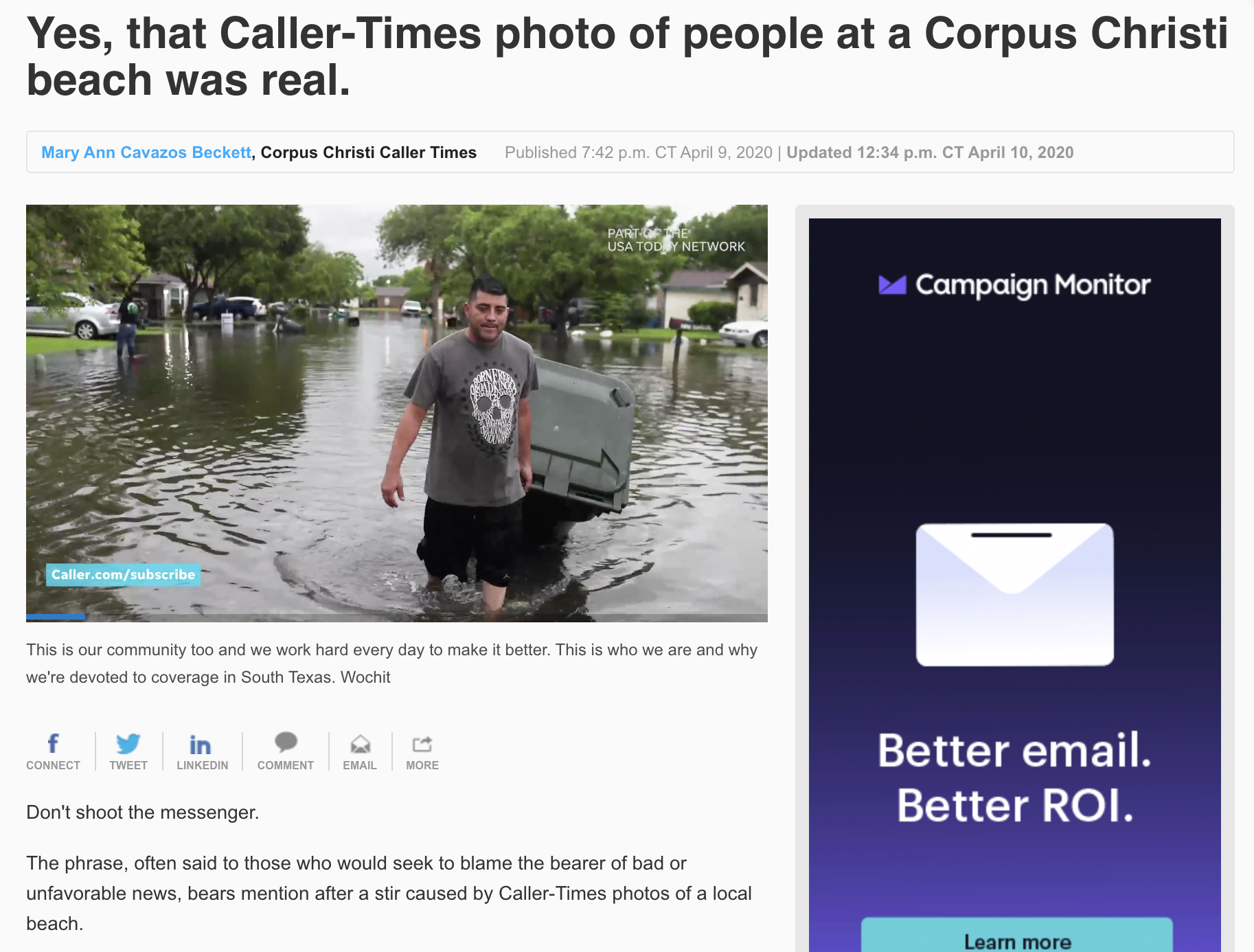 After facing accusations that a photojournalist altered a photo that showed a closed beach packed with people during the coronavirus pandemic, the Caller-Times wrote a column exculpating the photo. “We often face criticism and recognize people are entitled to opinions about what and how we cover the news. It comes with the territory. It also doesn’t change the facts. That’s why we typically let it roll on by and focus on what’s important: informing our community,” editor Mary Ann Cavazos Beckett wrote. “But when several people continued to spread false information about how and when the beach photo was taken it became concerning.” Beckett also explained and linked to the paper’s ethics policy and mission statement, reminding their audience of the paper’s commitment to accuracy and the community.