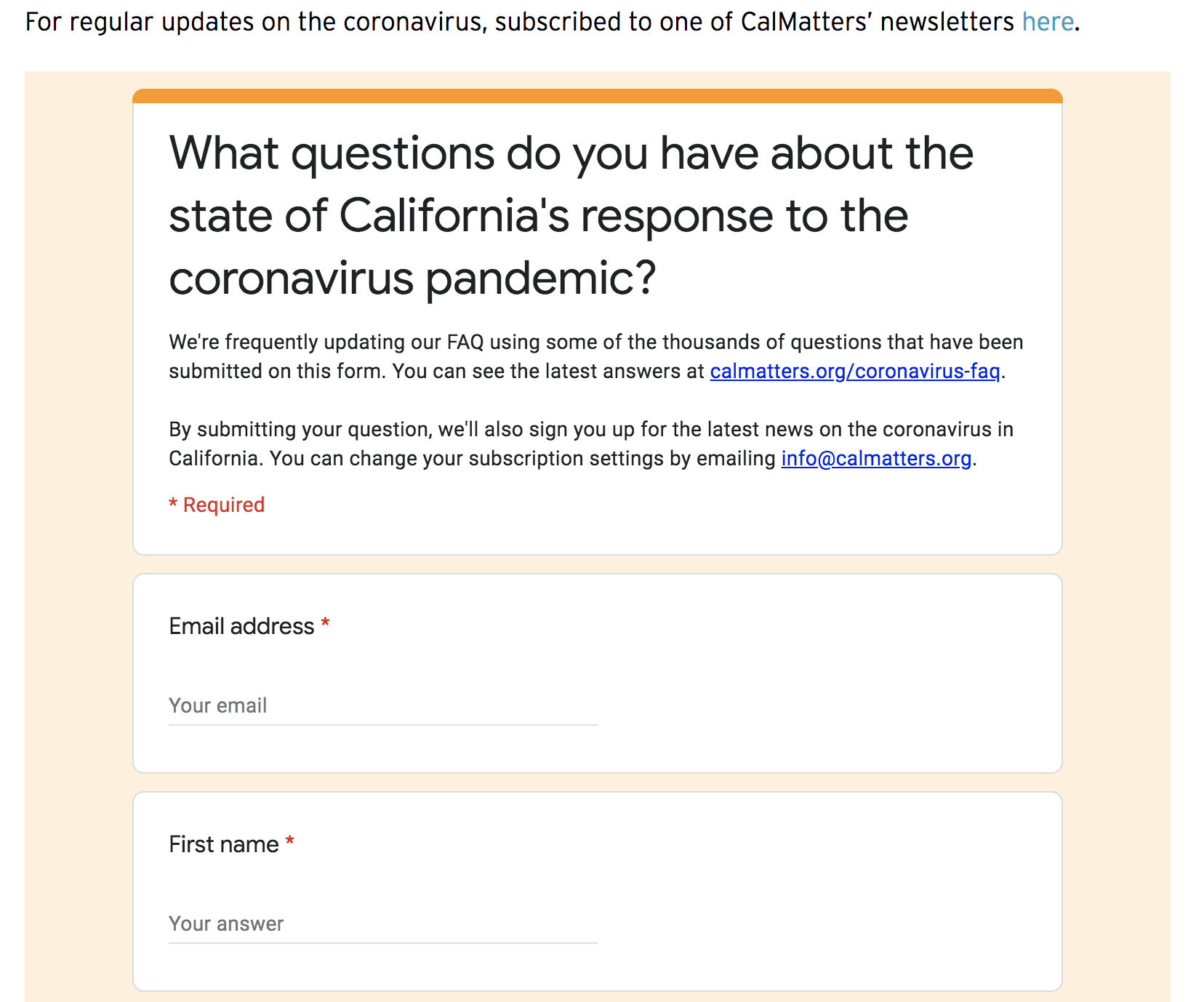 CalMatters engaged with their audience during the coronavirus pandemic by asking readers for their questions through a Google form at the bottom of their stories. They asked: “What questions do you have about the state of California’s response to the coronavirus pandemic?” The newsroom also linked to an FAQ where they compiled answers to previous reader questions about the virus, showing readers they valued their questions and feedback enough to follow up.