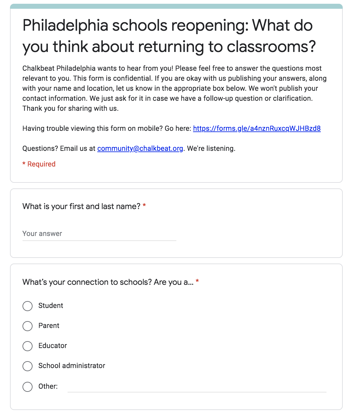 As schools in Philadelphia were having discussions about opening in the fall amidst the coronavirus outbreak, Chalkbeat reached out to its audience to get their feedback on the issue. “Chalkbeat wants to gain perspective from parents, students, and school staff. Tell us your feedback, concerns, and lingering questions below,” the post read.
