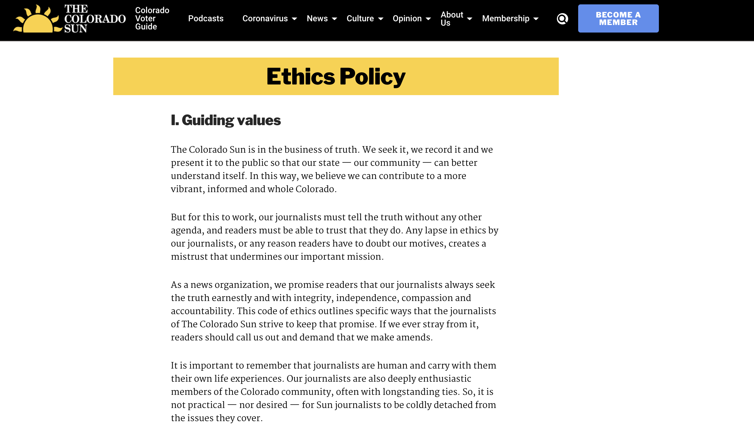 Creating an ethics landing page is a good way to start being more transparent about your journalism. On the Colorado Sun’s ethics page, they give an in-depth look at the newsroom’s guiding principles and standards for publication, including anonymous sources, paying for information, and how the newsroom strives for accuracy. The top of the page also shares the organizaton’s mission: “The Colorado Sun is in the business of truth. We seek it, we record it and we present it to the public so that our state — our community — can better understand itself. In this way, we believe we can contribute to a more vibrant, informed and whole Colorado.”