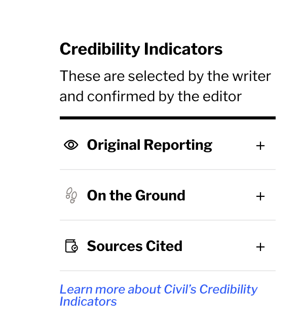 The Colorado Sun included Civil Credibility Indicators on its website to be more transparent about its reporting process. In this specific story, the indicators let readers know there was original and in-person reporting, and that all sources quotes in the story were fact-checked and deemed as credible. This work was done independently from Trusting News but embodies the work we do.