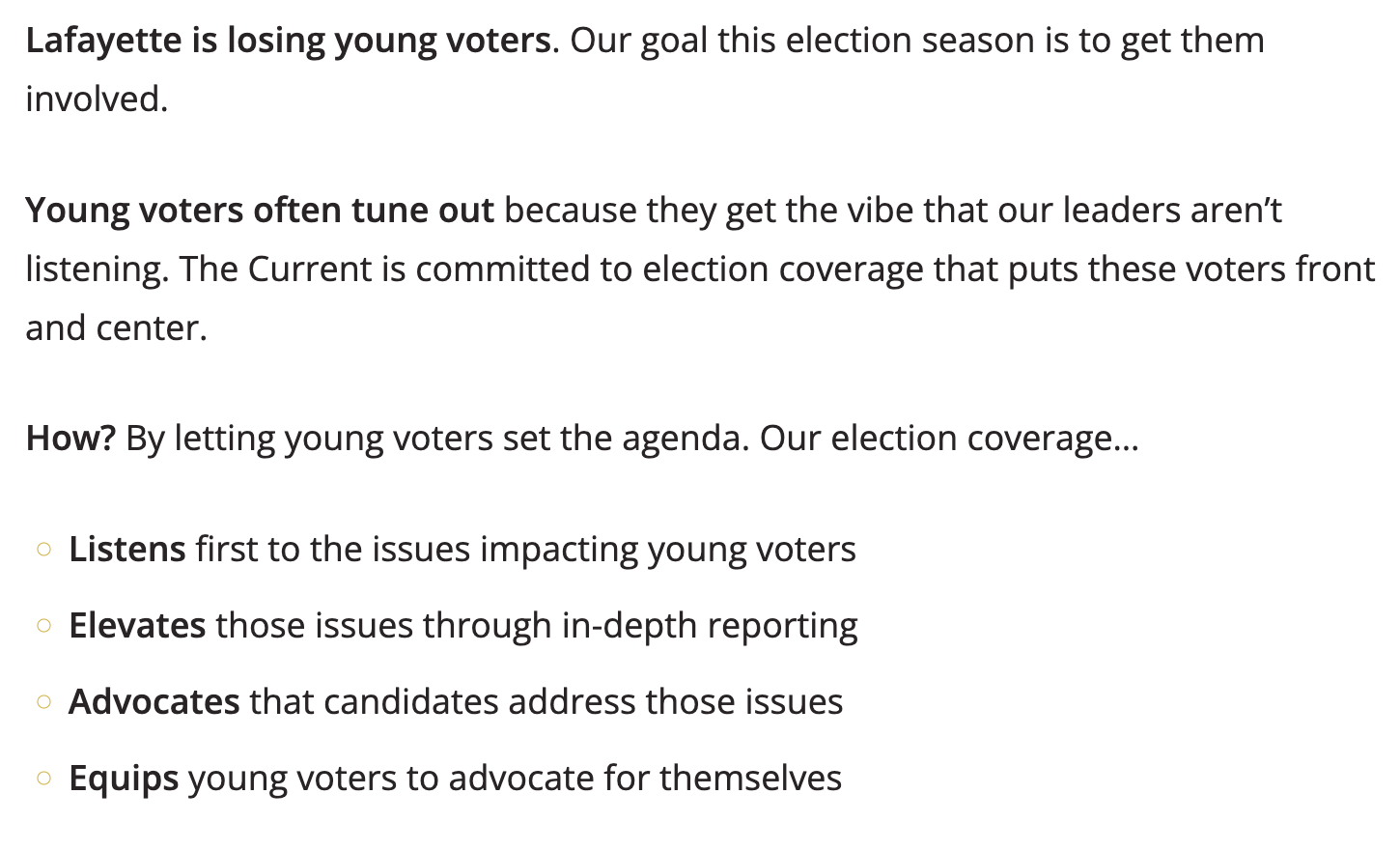 With its election mission statement, The Current does an amazing job explaining their election coverage goals with direct language that is relatable and understandable for the reader. By doing this the newsroom lays out what they are trying to accomplish and who they are trying to reach.