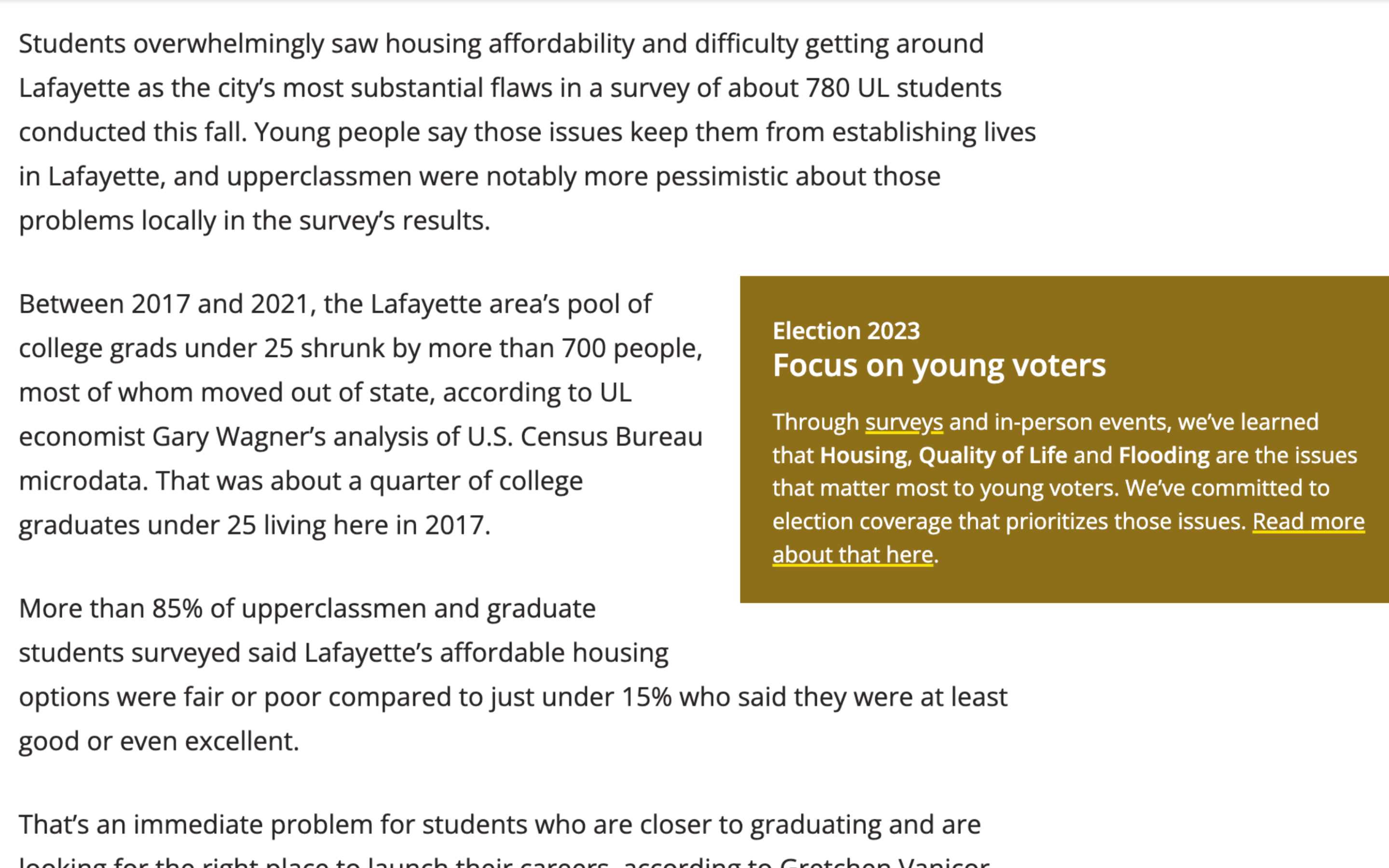 The Current team also links to their mission statement and FAQ page in daily coverage. In this story, they use a shaded box to explain why they are covering the topic of the story (young voters told them it was important) with a link to the FAQ page explaining their focus on young voters.