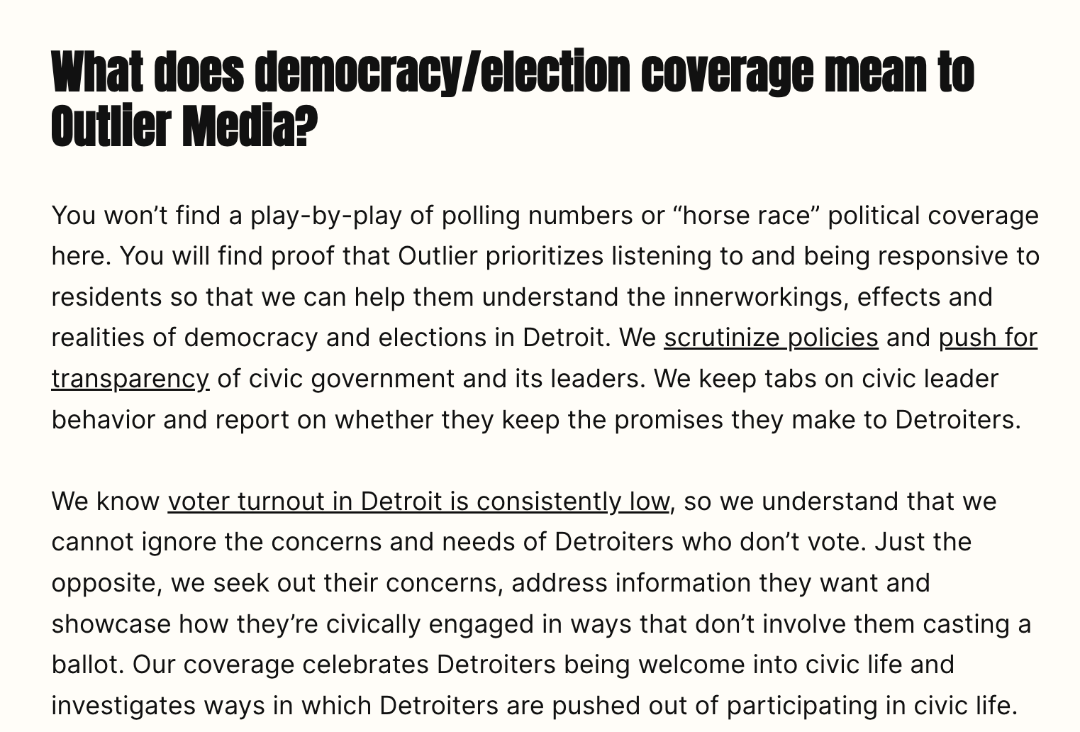 Outlier Media’s election FAQ page does a great job explaining what they will and will not cover during election season. It also explains some basic elements of journalism like how they fact-check. They explain that they make story coverage decisions based on feedback they receive from the community and prioritize what gets covered by thinking about what is not receiving news coverage and topics and issues that are actionable.