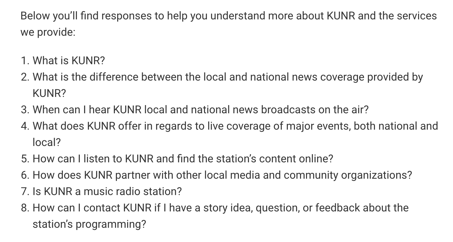 The KUNR team links to this FAQ from other content on their website, including this very helpful content guide, that explains how the newsroom covers topics the community said they are interested in. They also mentioned the FAQ and the explanations included in it during on-air promos about the station.