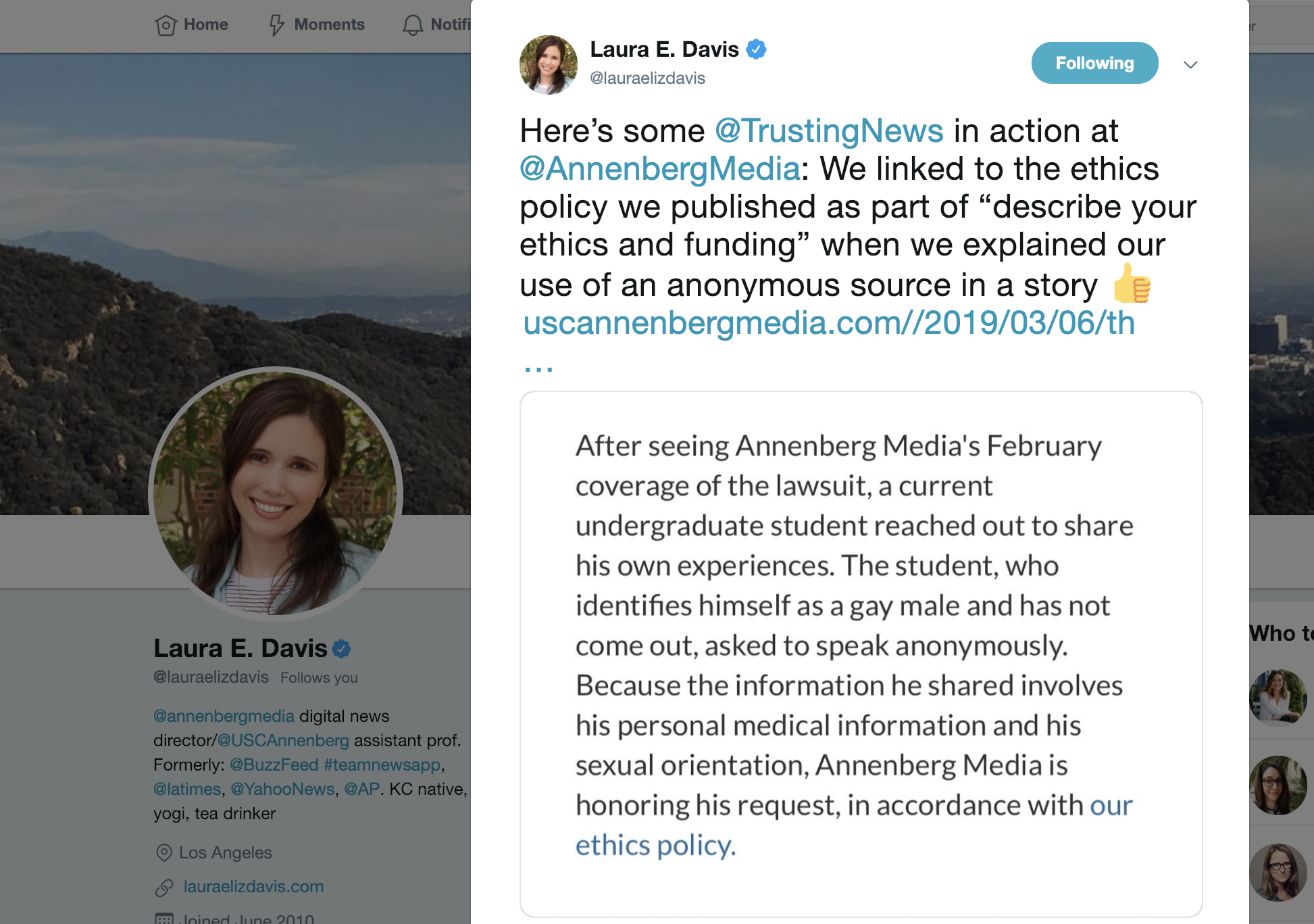 A core principle of our work is to make our ethics policies more accessible. Policies should be posted on news websites — that’s an important first step. But how many people will find them and read them? We should also look for every opportunity to show how they inform our daily decision making. Annenberg Media’s ethics page allows staff to link to an individual policy, and this example shows how they can do that from a specific part of a story.