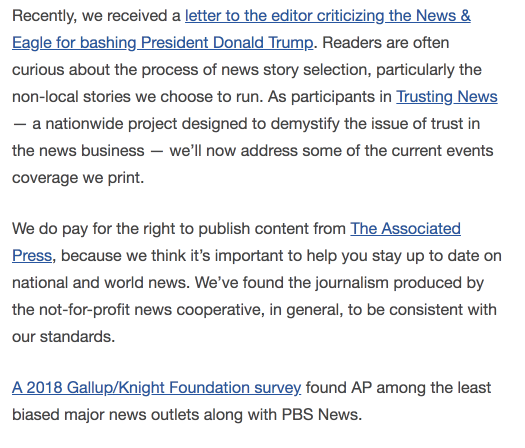 After receiving a letter from a reader who was critical of the paper’s national political coverage, Enid News & Eagle’s Editorial Board responded by explaining how and why it uses national content from The Associated Press. “We do pay for the right to publish content from The Associated Press, because we think it’s important to help you stay up to date on national and world news,” the board wrote.