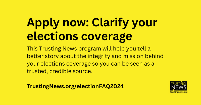 At Trusting News, we want to help newsrooms be seen as a trusted, credible source for election news. That’s why we’re launching a 5-week program, “Clarifying Election Coverage,” that will help newsrooms tell a better story about the integrity and mission behind their election coverage. Applications are open through April 26.