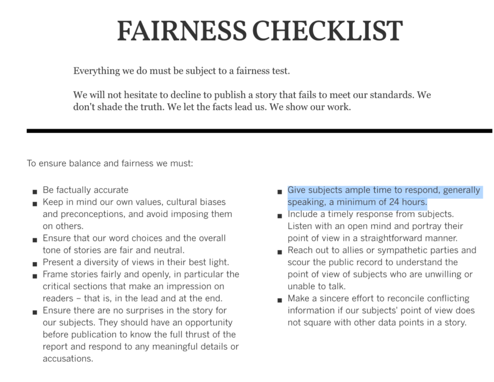 The Union Tribune has a public-facing “Fairness Checklist” they use as a guidepost when reporting stories. Specifically they include that they “Give subjects ample time to respond, generally speaking, a minimum of 24 hours.”