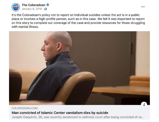 When sharing a story about someone who died by suicide on Facebook, the Coloradoan used the post as a way to explain the newsroom’s ethics and policies round covering suicide.