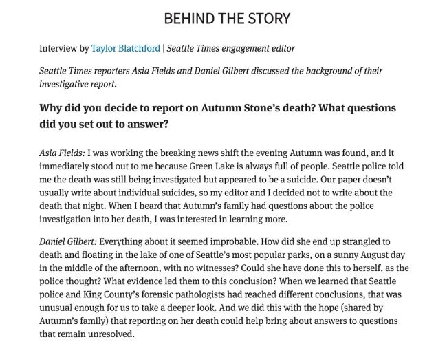 The Seattle Times included a “Behind the Story” box that ran at the bottom of a major investigation where reporters answered questions about their reporting process.