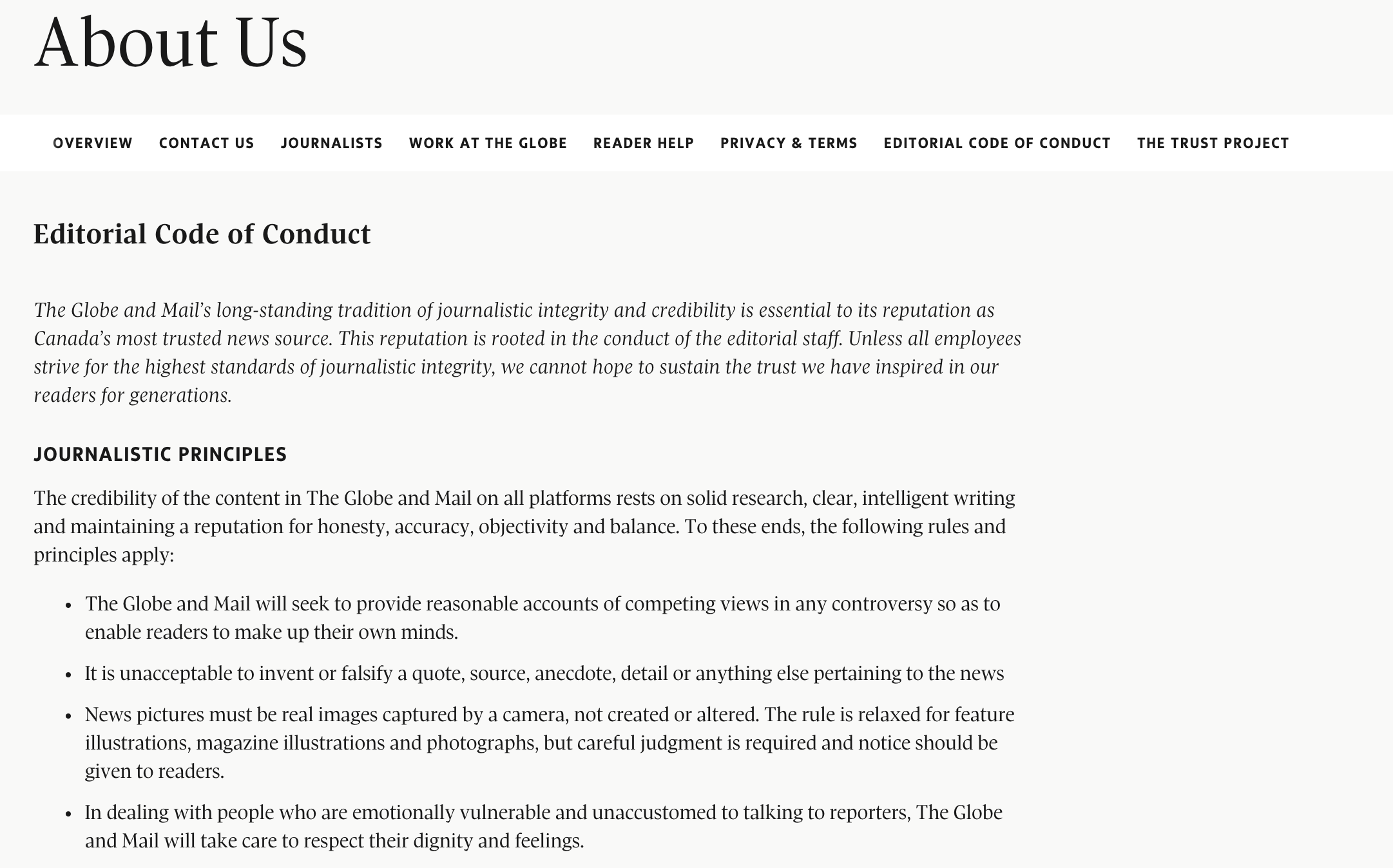 The Globe and Mail posted its Editorial Code of Conduct on its website, letting its audience know about their newsroom’s mission and goals. The code of conduct included information on many different aspects of the newsroom’s standards, including its policy for deleting comments and how their journalists fact-checked stories. “The Globe and Mail’s long-standing tradition of journalistic integrity and credibility is essential to its reputation as Canada’s most trusted news source,” the code of conduct reads. “This reputation is rooted in the conduct of the editorial staff. Unless all employees strive for the highest standards of journalistic integrity, we cannot hope to sustain the trust we have inspired in our readers for generations.” This work was done independently from Trusting News but embodies the work we do.