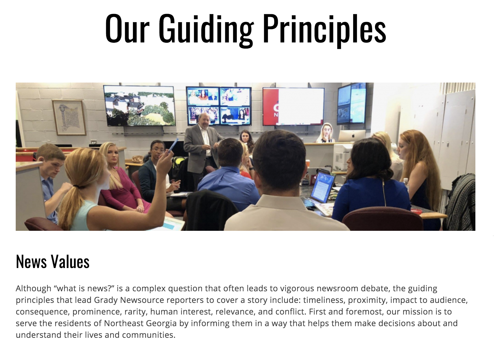 Grady Newsource publicly posted it’s guiding principles on their “About Us” page, including its mission, reporting process and newsroom standards. The principles state in clear language how the paper handles corrections, verifies facts and explains it’s protocol when covering sensitive situations, like sexual assault accusations and suicide. “Our mission is to serve the residents of Northeast Georgia by informing them in a way that helps them make decisions about and understand their lives and communities,” they wrote. The news team also admits that defining “what is news,” can be difficult but they try to be consistent and pick stories based on their mission and principles.