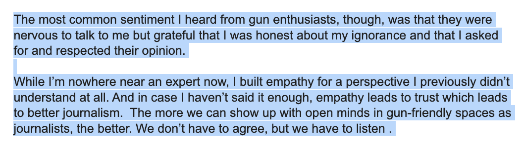 Root reporting in humility and curiosity. Diedrich showed a lot of both by being upfront about his own knowledge gaps and sharing how his perspectives were challenged by his reporting. While yes, it can be good to signal your credibility as a reporter (Diedrich does this by sharing a list of his previous reporting on guns and conflict), being honest about what you don’t know will help strengthen your reporting and increase empathy.