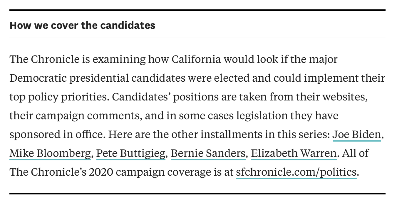 In a story about presidential candidate Amy Klobuchar, the San Fransisco Chroncicle inserted language in the story to tell readers how and why they were covering Democratic presidential candidates, and how the paper was striving to provide equal coverage. “The Chronicle is examining how California would look if the major Democratic presidential candidates were elected and could implement their top policy priorities,” the box read. “Candidates’ positions are taken from their websites, their campaign comments, and in some cases legislation they have sponsored in office.”