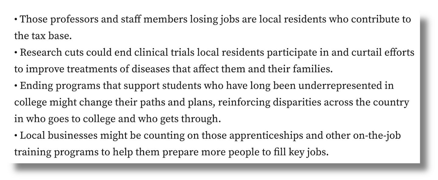 “As we report on new federal policy that takes aim at colleges and universities, it’s important that we also articulate why they matter. Cuts to federal research funding aren’t theoretical; they have lasting effects on communities and people beyond the walls of an institution,” Murphy wrote in an email last week.