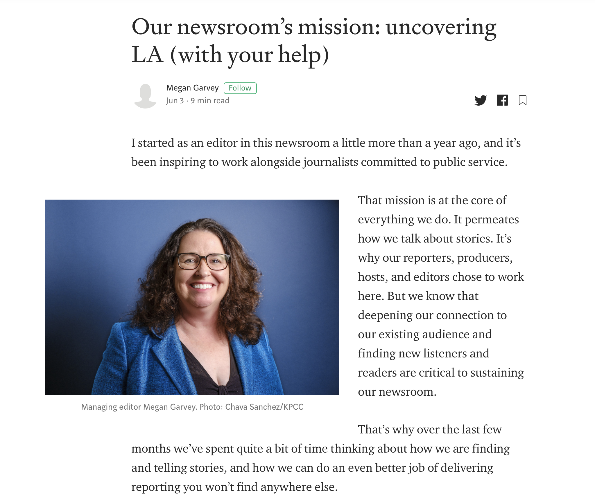 Does your community know your organization’s mission? KPCC/LAist’s Editor Megan Garvey wrote a column explaining the station’s dedication to public service and explicitly shared the topics and questions each reporter was committed to covering. “We know we have to earn and keep your trust by delivering fair and accurate reporting. We know we need to make important stories interesting,” Garvey wrote. “And we also know we need to be more transparent in our process and better explain how we report stories.”