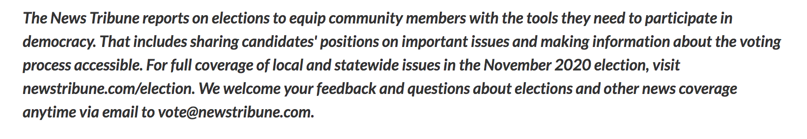 The News Tribune included an editor’s note at the top of their coverage that stated the newsroom’s mission with their elections content, where to see all the election content, and how to contact the newsroom. “The News Tribune reports on elections to equip community members with the tools they need to participate in democracy. That includes sharing candidates’ positions on important issues and making information about the voting process accessible,” the note reads.