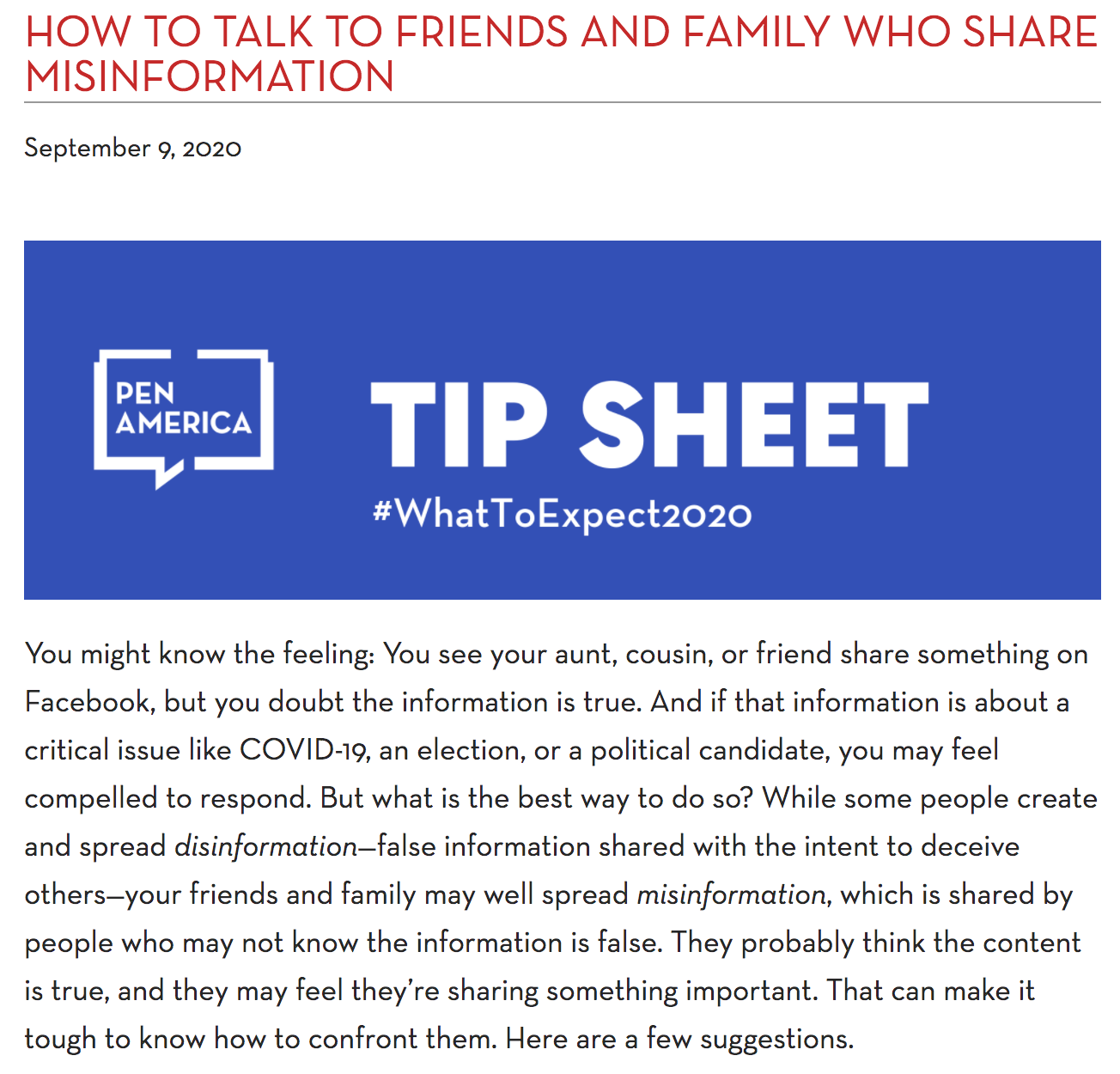 PEN America wrote a guide for how to talk to friends and family who share misinformation, including how to verify information and avoid escalation on social media. “While some people create and spread disinformation—false information shared with the intent to deceive others—your friends and family may well spread misinformation, which is shared by people who may not know the information is false. They probably think the content is true, and they may feel they’re sharing something important. That can make it tough to know how to confront them. Here are a few suggestions.” This work was done independently from Trusting News but embodies the work we do.