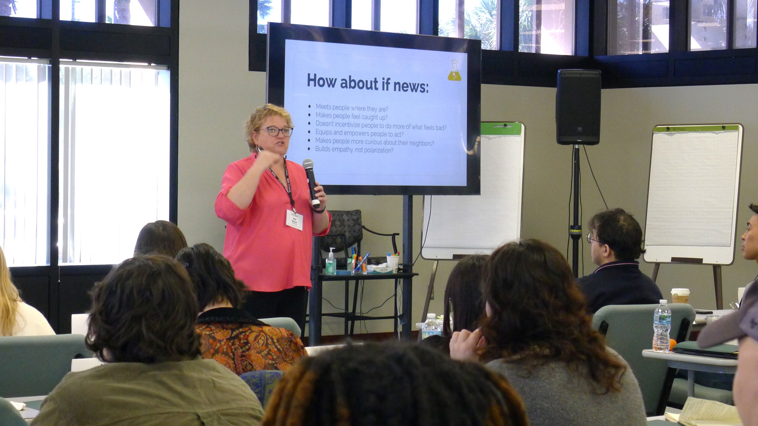 Trusting News Director Joy Mayer trains a group of Koch Fellows at the Poynter Institute in St. Petersburg, Florida, on Feb. 7, 2024. Photo by Gil Asakawa.