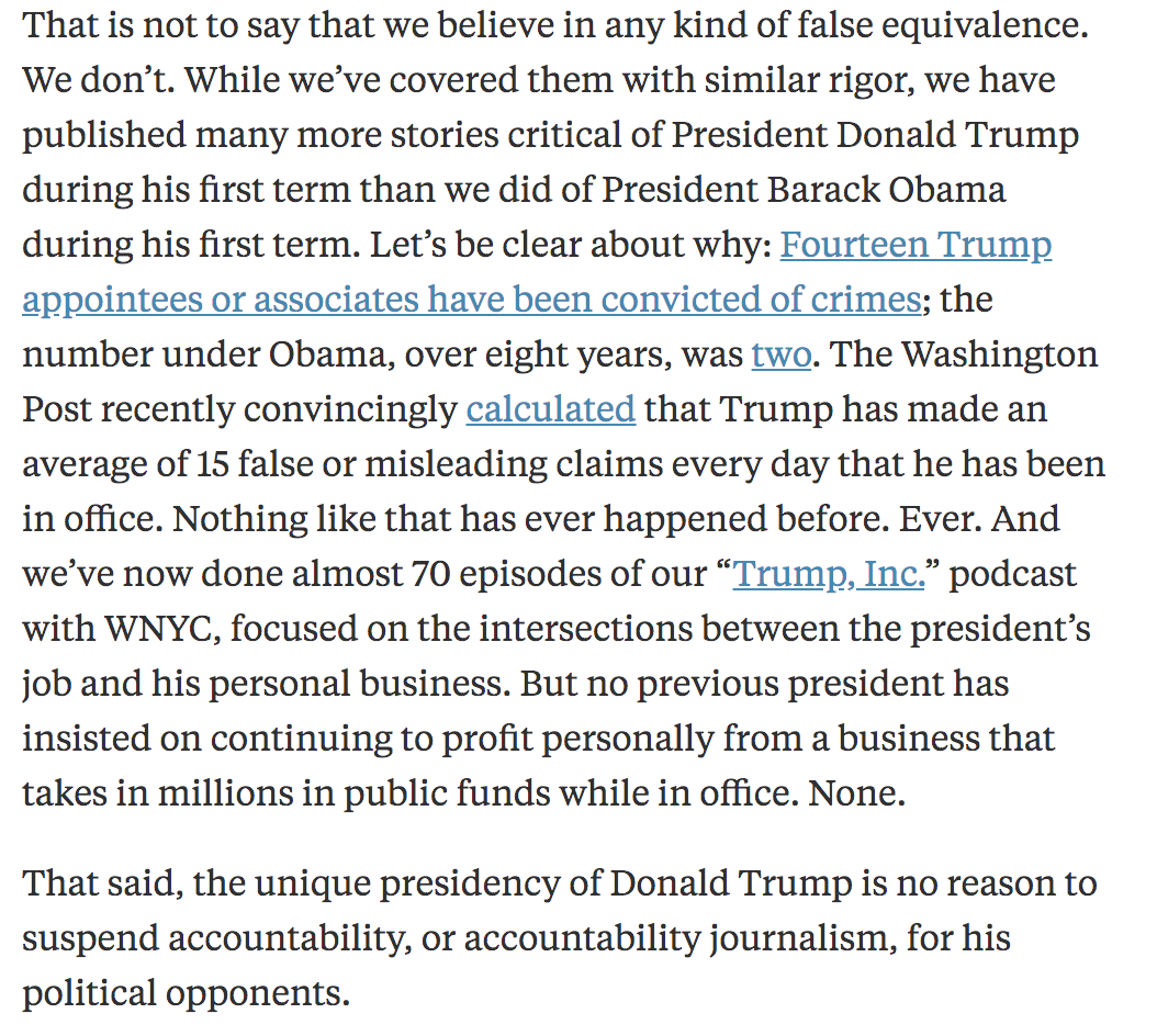 ProPublica sent out a newsletter to the people who have supported them financially that talked directly about political bias in news. The organization’s president Richard Tofel, who penned the newsletter, shared that yes, the newsroom has written more stories critical of President Trump than President Obama, and went on to explain in detail why that’s the case. Tofel also was very transparent about what ProPublica’s audience looked like (that it tends to be more liberal) and why they wish they had more conservative and non-white readers. “ProPublica would be more effective if our readership contained a proportion of people of color closer to the population of the country, and if it contained a similar proportion of self-identified conservatives,” Tofel wrote. This work was done independently from Trusting News but embodies the work we do.