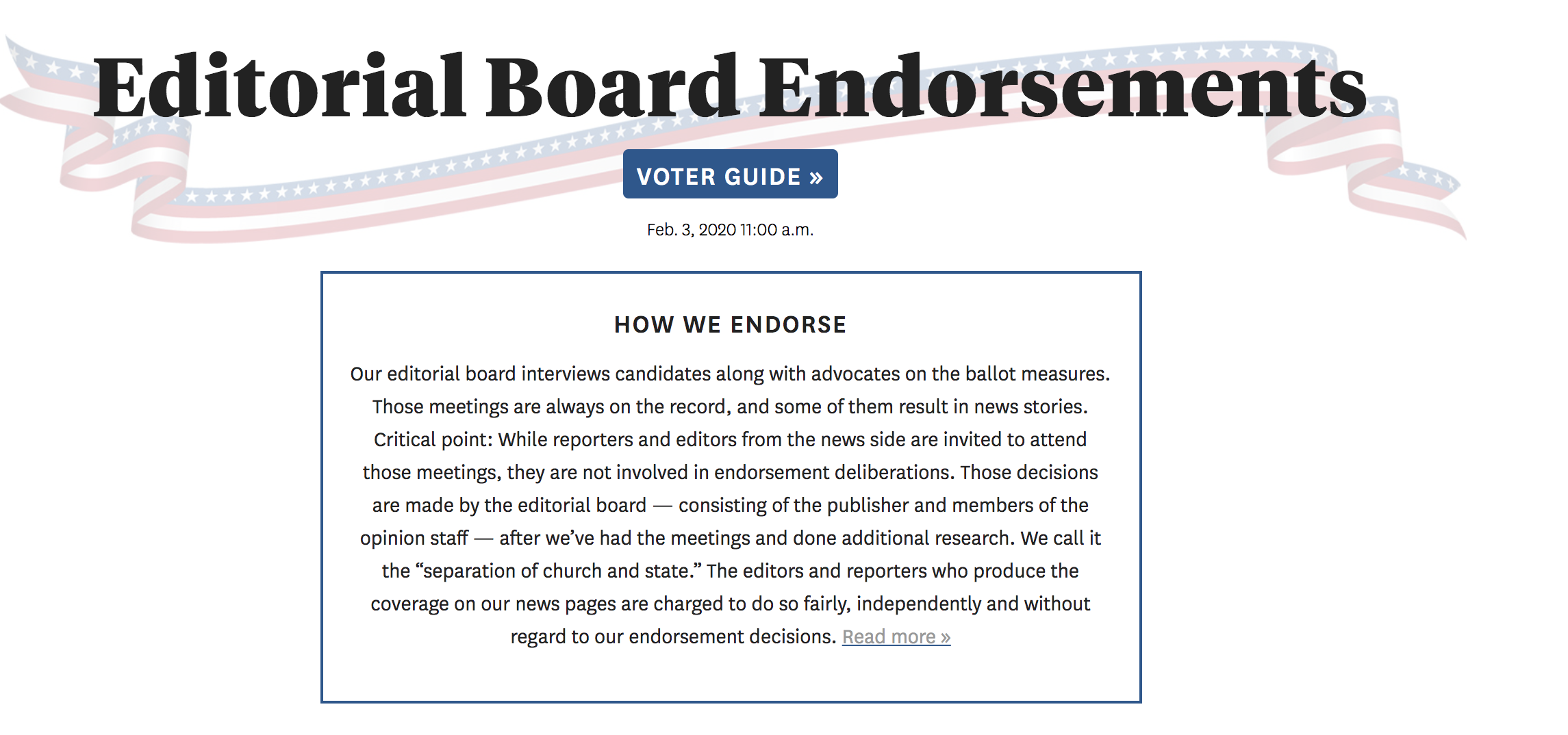 In a story explaining the paper’s endorsements for an upcoming election, the San Fransisco Chronicle included a box that clearly explained what the editorial board was and how the endorsement process worked. “These endorsements are made by the editorial board, which consists of the opinion pages’ writers and editors, after researching the issues and interviewing the candidates,” the box read. The paper also included a link to a column explaining how and why the newspaper makes endorsements.