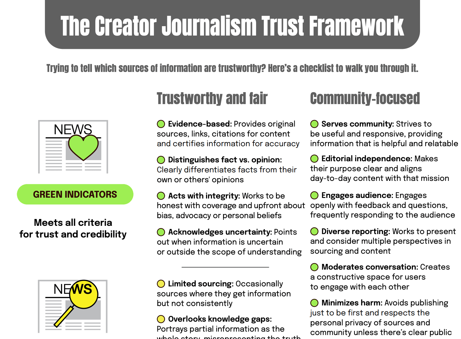 We created this checklist to help. It’s designed to walk creator journalists through the core ethics of journalism and how to get clear about those ethics with their audience. Not only will this help your bottom line by deepening trust and loyalty with your audience, but it will also help make it easier for people to find and access credible news.