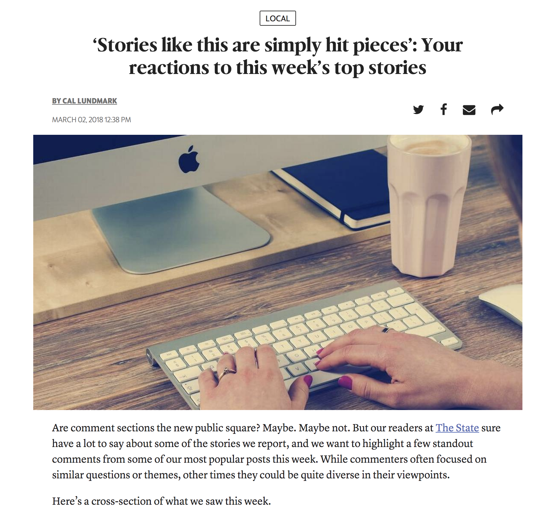 The State highlighted reader’s responses by posting a roundup of people’s comments and reactions to popular news stories that week. When the comment was a question about the facts of the news story or how the journalists put the story together, they answered them. Here is one of the responses provided: “Why did we write this story? The public scrutinizes so many aspects of candidates’ work and lives, and journalists make continual judgment calls about what information is interesting and relevant, and therefore worthy of coverage. Reader feedback about those judgment calls is always welcome.”