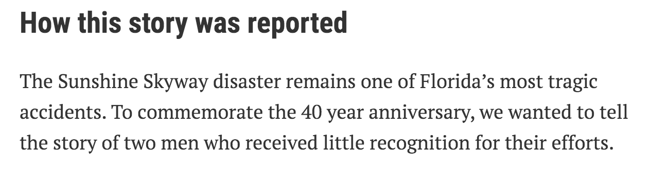 When publishing a story about a deadly accident that occurred 40 years ago, the Tampa Bay Times included a box that explained why the paper was reporting on a historical incident and how the story was reported. “The Sunshine Skyway disaster remains one of Florida’s most tragic accidents. To commemorate the 40-year anniversary, we wanted to tell the story of two men who received little recognition for their efforts. The information in this story was gathered over four months, involving multiple interviews,” the box read.