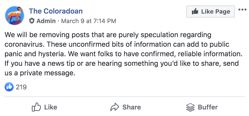 In a community Facebook group run by the Coloradoan, the newsroom told users they would not be allowing posts that included speculation or misinformation about the COVID-19 pandemic. “We will be removing posts that are purely speculation regarding coronavirus,” the post read. “These unconfirmed bits of information can add to public panic and hysteria. We want folks to have confirmed, reliable information. If you have a news tip or are hearing something you’d like to share, send us a private message.” By moderating comments for misinformation, it shows your audience you’re committed to accuracy and getting the facts straight.