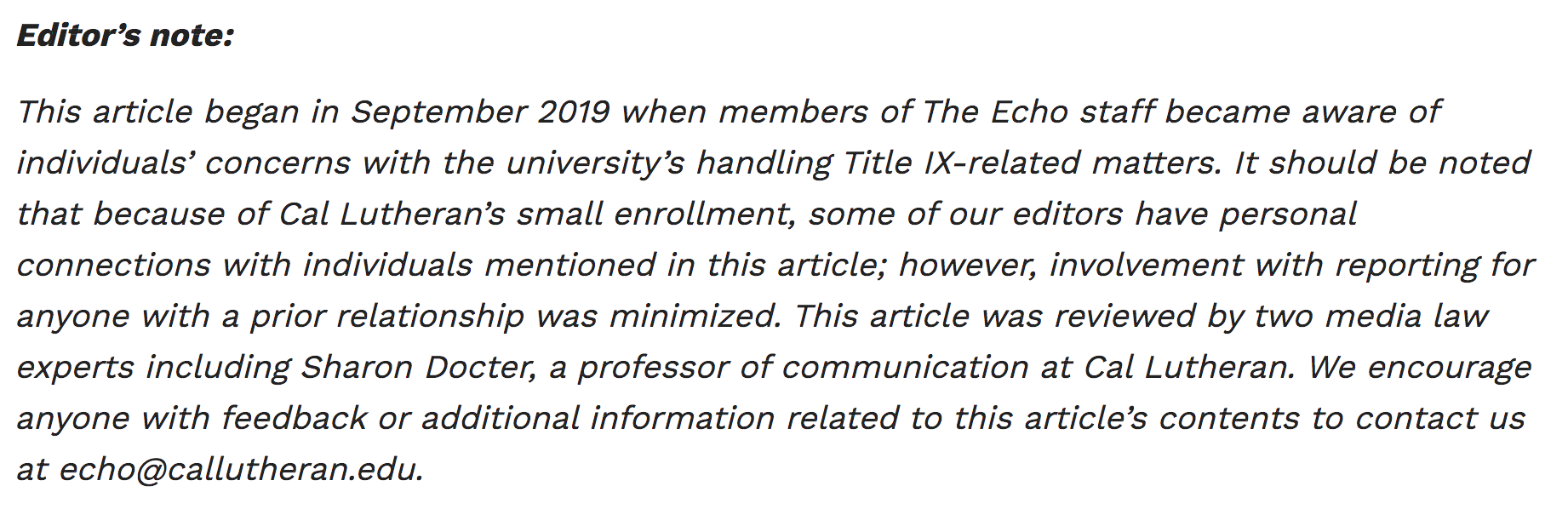 When the student newspaper The Echo was writing about possible Title IX violations at its school, the paper included an editor’s note at the bottom of the story to let readers know about possible conflicts of interest. “It should be noted that because of Cal Lutheran’s small enrollment, some of our editors have personal connections with individuals mentioned in this article; however, involvement with reporting for anyone with a prior relationship was minimized. This article was reviewed by two media law experts including Sharon Docter, a professor of communication at Cal Lutheran.” This work was done independently from Trusting News but embodies the work we do.