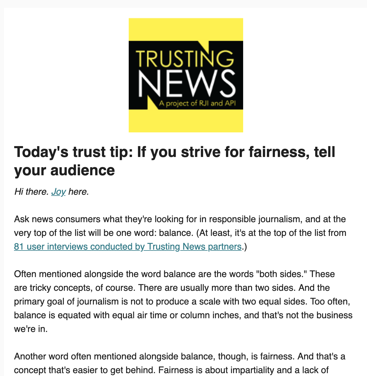 Ask news consumers what they’re looking for in responsible journalism, and at the very top of the list will be one word: balance. (At least, it’s at the top of the list from 81 user interviews conducted by Trusting News partners. Often mentioned alongside the word balance are the words “both sides.” These are tricky concepts, of course. There are usually more than two sides. And the primary goal of journalism is not to produce a scale with two equal sides. Too often, balance is equated with equal air time or column inches, and that’s not the business we’re in. To read more from this edition click here and you can sign up for the weekly “Trust Tips” newsletter by clicking here.