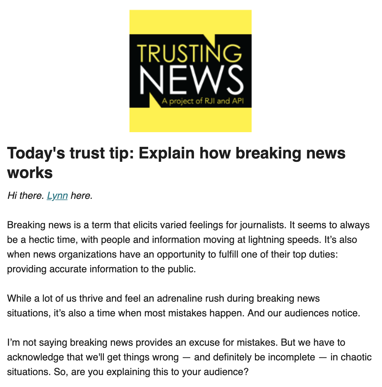 Breaking news is a term that elicits varied feelings for journalists. It seems to always be a hectic time, with people and information moving at lightning speeds. It’s also when news organizations have an opportunity to fulfill one of their top duties: providing accurate information to the public. While a lot of us thrive and feel an adrenaline rush during breaking news situations, it’s also a time when most mistakes happen. And our audiences notice. To read more from this edition click here and you can sign up for the weekly “Trust Tips” newsletter by clicking here.