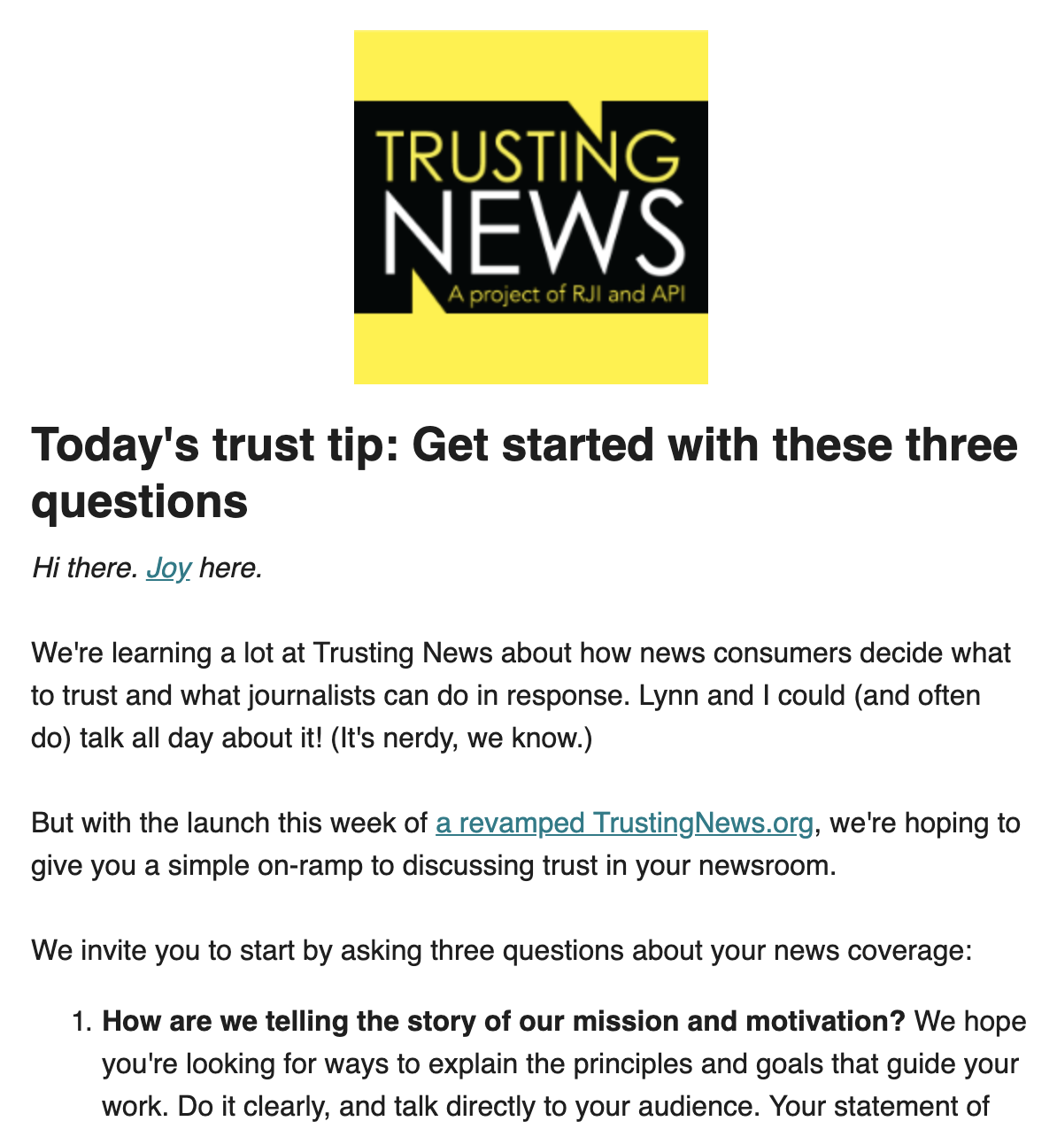 We’re learning a lot at Trusting News about how news consumers decide what to trust and what journalists can do in response. Lynn and I could (and often do) talk all day about it! (It’s nerdy, we know.) But with the launch this week of a revamped TrustingNews.org, we’re hoping to give you a simple on-ramp to discussing trust in your newsroom. To read more from this edition click here and you can sign up for the weekly “Trust Tips” newsletter by clicking here.