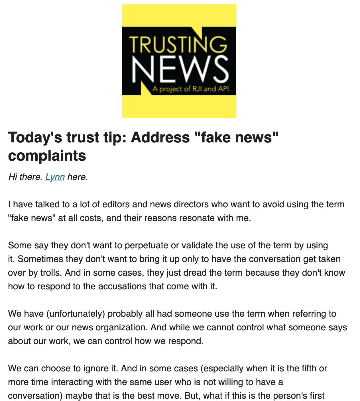 I have talked to a lot of editors and news directors who want to avoid using the term “fake news” at all costs, and their reasons resonate with me. Some say they don’t want to perpetuate or validate the use of the term by using it. Sometimes they don’t want to bring it up only to have the conversation get taken over by trolls. And in some cases, they just dread the term because they don’t know how to respond to the accusations that come with it. More from this edition can be found here and to receive the tips in your inbox each week click here