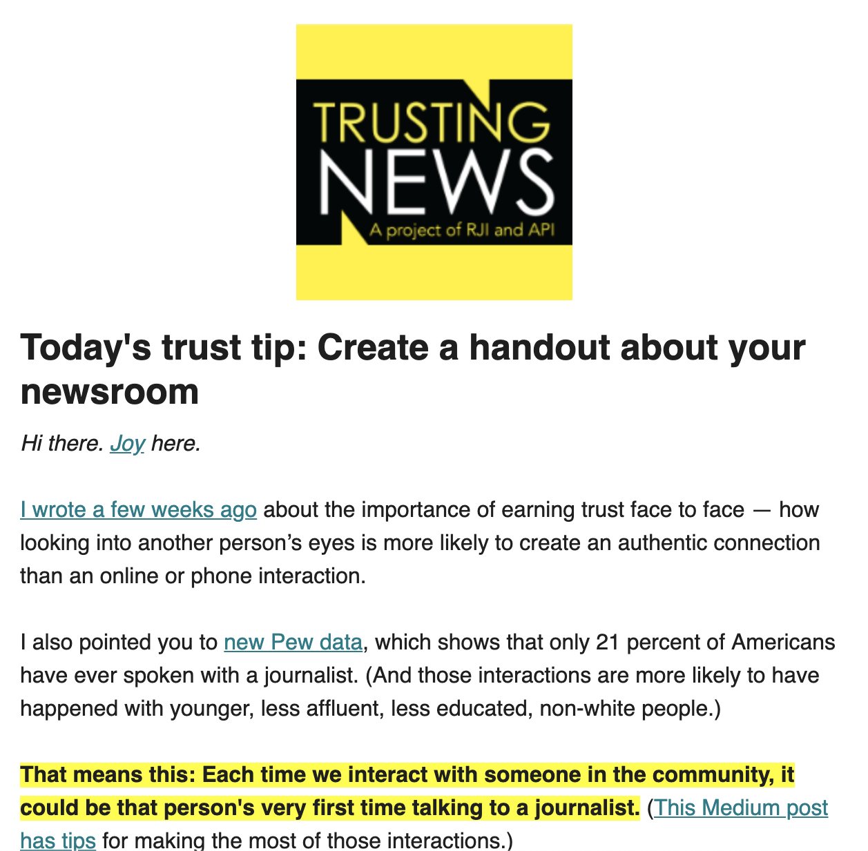 I wrote a few weeks ago about the importance of earning trust face to face — how looking into another person’s eyes is more likely to create an authentic connection than an online or phone interaction. I also pointed you to new Pew data, which shows that only 21 percent of Americans have ever spoken with a journalist. (And those interactions are more likely to have happened with younger, less affluent, less educated, non-white people.) More from this edition can be found here and to receive the tips in your inbox each week click here.