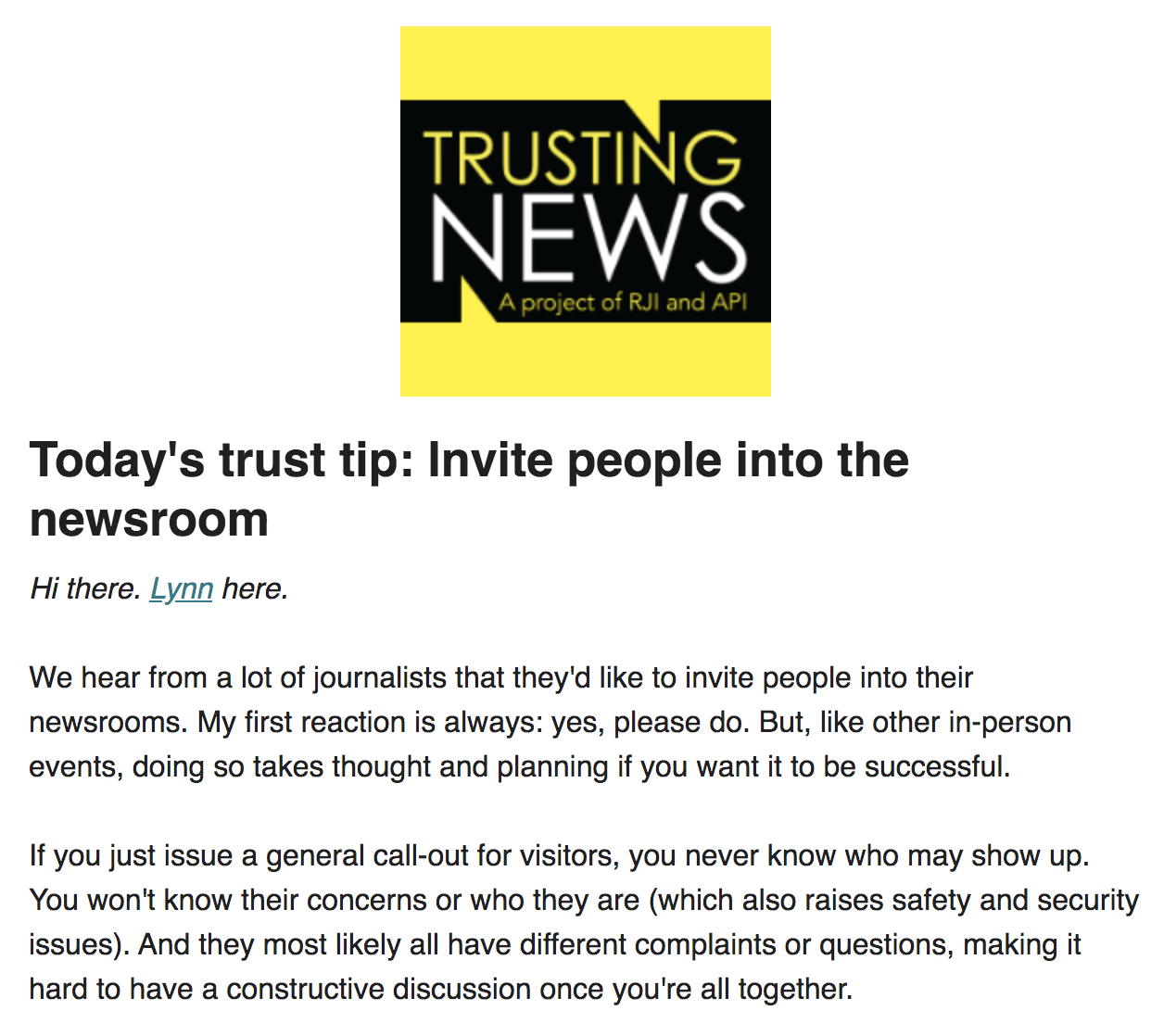 We hear from a lot of journalists that they’d like to invite people into their newsrooms. My first reaction is always: yes, please do. But, like other in-person events, doing so takes thought and planning if you want it to be successful. If you just issue a general call-out for visitors, you never know who may show up. You won’t know their concerns or who they are (which also raises safety and security issues). And they most likely all have different complaints or questions, making it hard to have a constructive discussion once you’re all together. But inviting people in can be a really effective way to engage with your audience. More from this edition can be found here and to receive the tips in your inbox each week click here.