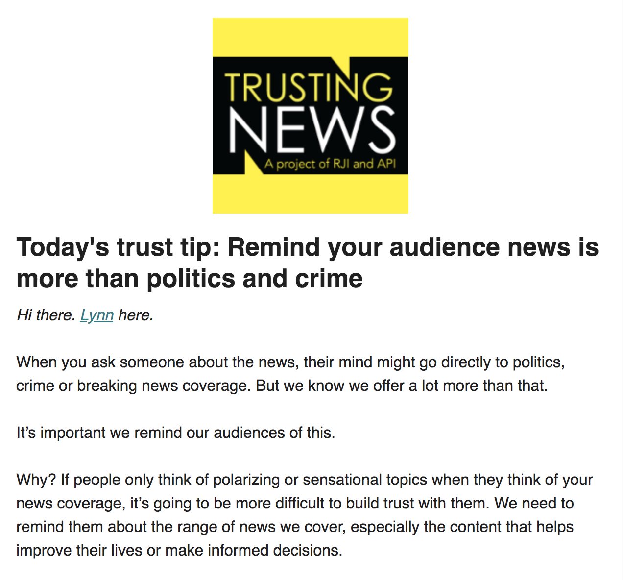 When you ask someone about the news, their mind might go directly to politics, crime or breaking news coverage. But we know we offer a lot more than that. It’s important we remind our audiences of this. Why? If people only think of polarizing or sensational topics when they think of your news coverage, it’s going to be more difficult to build trust with them. We need to remind them about the range of news we cover, especially the content that helps improve their lives or make informed decisions. More from this edition can be found here and to receive the tips in your inbox each week click here.