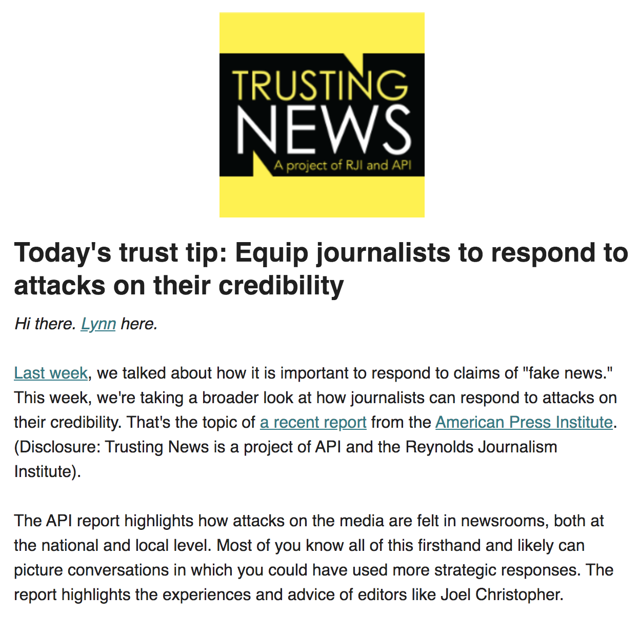 Last week, we talked about how it is important to respond to claims of “fake news.” This week, we’re taking a broader look at how journalists can respond to attacks on their credibility. That’s the topic of a recent report from the American Press Institute. (Disclosure: Trusting News is a project of API and the Reynolds Journalism Institute). The API report highlights how attacks on the media are felt in newsrooms, both at the national and local level. Most of you know all of this firsthand and likely can picture conversations in which you could have used more strategic responses. The report highlights the experiences and advice of editors like Joel Christopher. More from this edition can be found here and to receive the tips in your inbox each week click here.