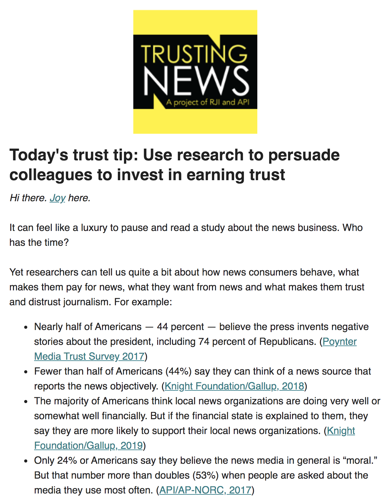 It can feel like a luxury to pause and read a study about the news business. Who has the time? Yet researchers can tell us quite a bit about how news consumers behave, what makes them pay for news, what they want from news and what makes them trust and distrust journalism. For example: Nearly half of Americans — 44 percent — believe the press invents negative stories about the president, including 74 percent of Republicans. (Poynter Media Trust Survey 2017) Fewer than half of Americans (44%) say they can think of a news source that reports the news objectively. (Knight Foundation/Gallup, 2018) The majority of Americans think local news organizations are doing very well or somewhat well financially. But if the financial state is explained to them, they say they are more likely to support their local news organizations. (Knight Foundation/Gallup, 2019) Only 24% or Americans say they believe the news media in general is “moral.” But that number more than doubles (53%) when people are asked about the media they use most often. (API/AP-NORC, 2017) More from this edition can be found here and to receive the tips in your inbox each week click here.